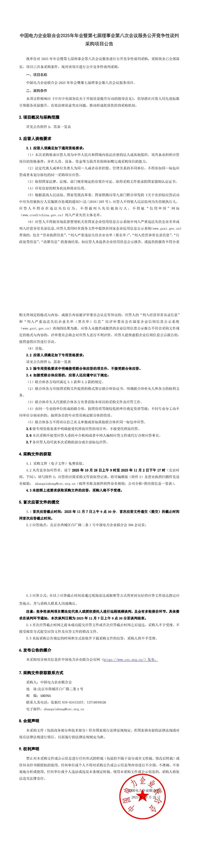中国电力企业联合会2025年年会暨第七届理事会第八次会议服务公开竞争性谈判项目采购公告