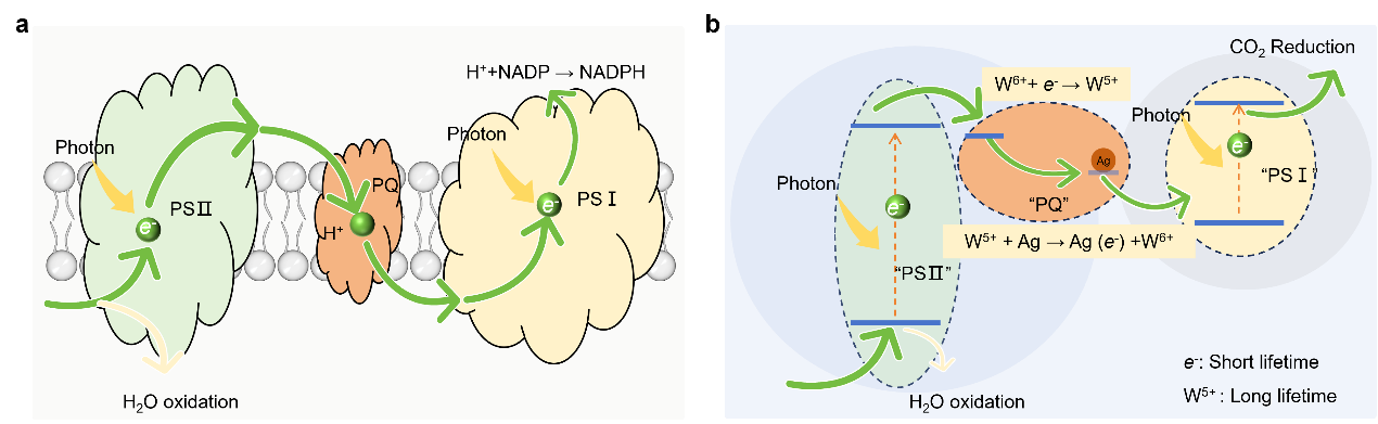 记者从中国科学院地球环境研究所获悉,该所空气净化新技术团队受植物光合作用启发,提出了一种实现二氧化碳与水协同转化的通用策略。相关成果1月31日在国际学术期刊《自然・通讯》发表。△图1 模仿植物光合作用的电子存储工作机制 植物通过光合作用,巧妙地将结构简单的二氧化碳和水转化为复杂的养分分子,为人类借助化学手段实现温室气体二氧化碳的资源化利用提供了自然范例。然而,人工模拟光合作用的过程仍面临科学挑战,其关键瓶颈在于:光激发功能材料所产生的电子(用于还原二氧化碳)与空穴(用于氧化水)寿命极短,难以