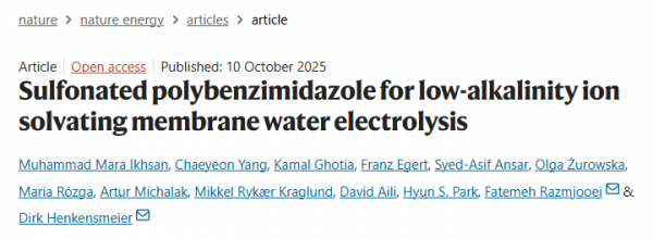 随着绿色氢气成为下一代关键清洁能源,实现其稳定且低成本生产的技术已成为重大挑战。然而,传统水电解技术在大规模应用中受到高系统成本和高运维负担的限制。尤其是在长期运行过程中,性能衰减和维护成本上升的问题严重阻碍了商业化进程。因此,市场对能够同时提升效率、稳定性和成本竞争力的新型电解技术需求日益增长。 韩国科学技术研究院(KIST,院长Sang-Rok Oh)氢能与燃料电池研究中心,由Dirk Henkensmeier博士领导的研究团队,开发出一种新型水电解膜材料,该材料在低碱度条件下依然能够稳