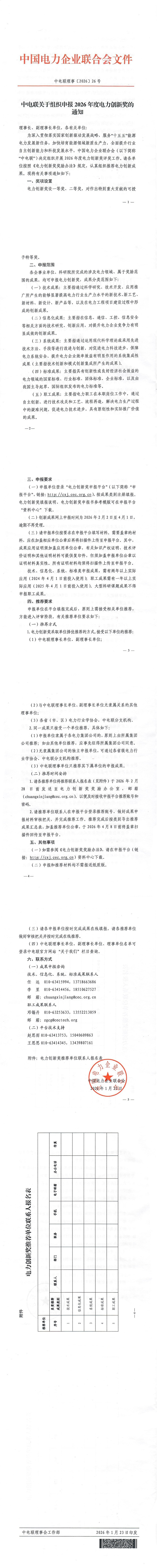 中电联关于组织申报2026年度电力创新奖的通知