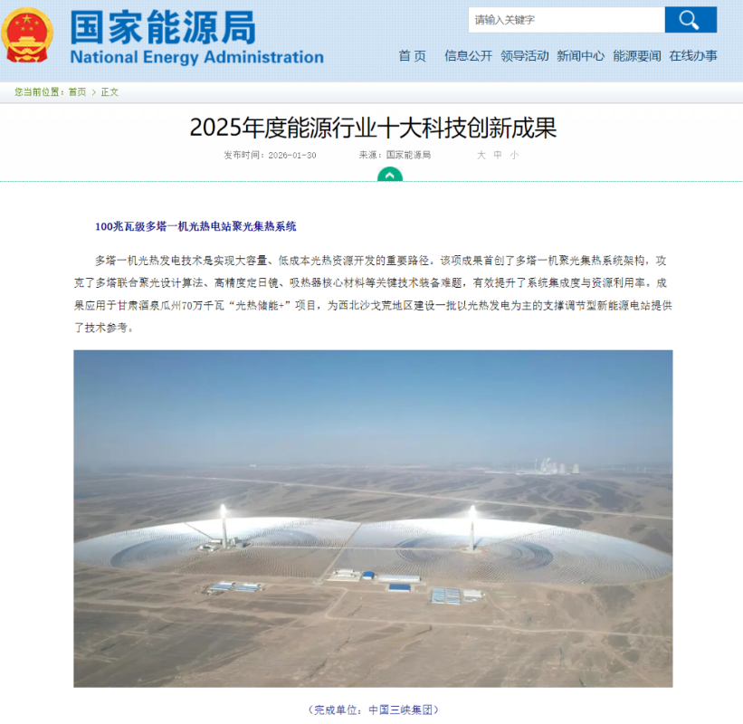 三峡集团“100兆瓦级多塔一机光热电站聚光集热系统”入选国家能源局十大科技创新成果 本网讯(王璐)近日,国家能源局发布2025年度能源行业十大科技创新成果,由三峡集团打造的“100兆瓦级多塔一机光热电站聚光集热系统”成功入选。截至目前,三峡集团科创成果已连续3年入选该榜单。 光热电站通过光学装置汇聚太阳能并转化为热能,再借助储热系统实现非日照时段连续发电。多年以来,传统塔式光热电站采用“单塔单机”模式,即