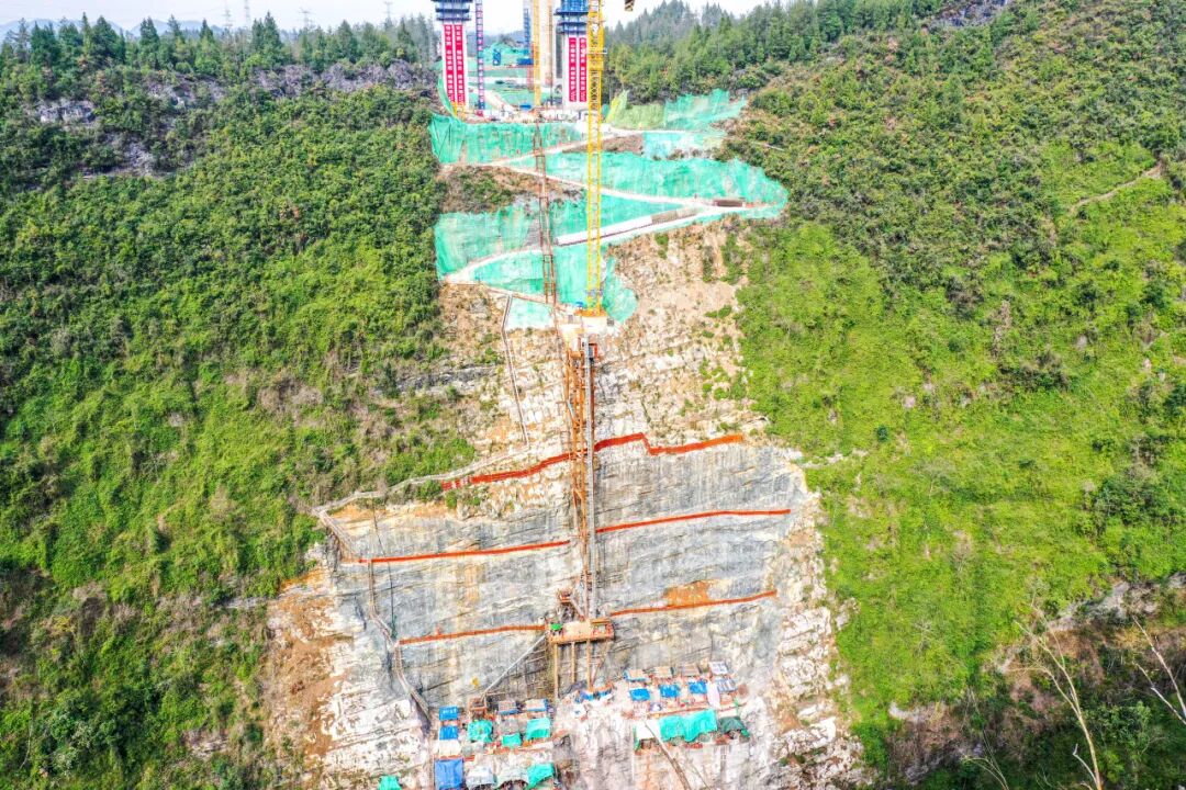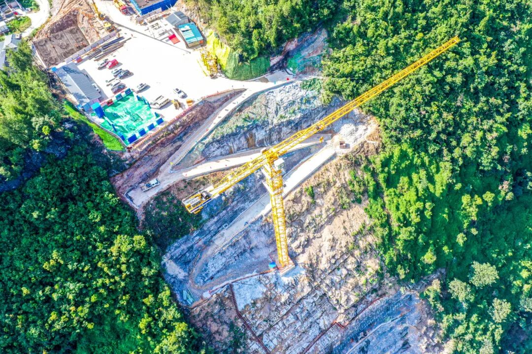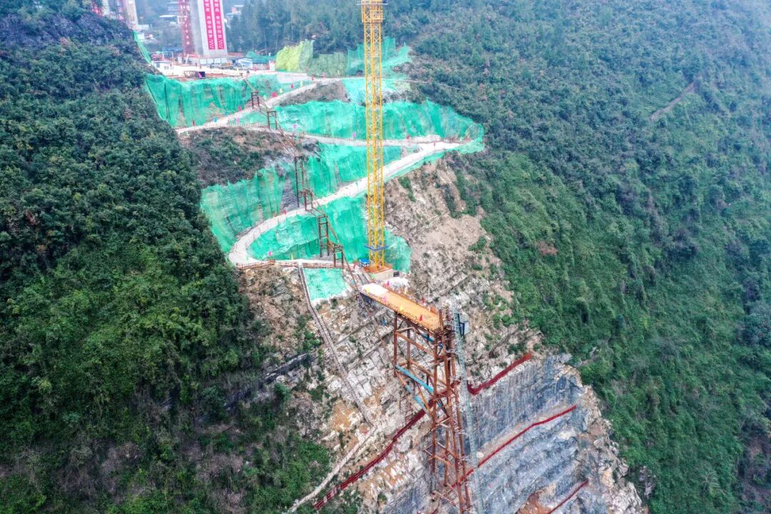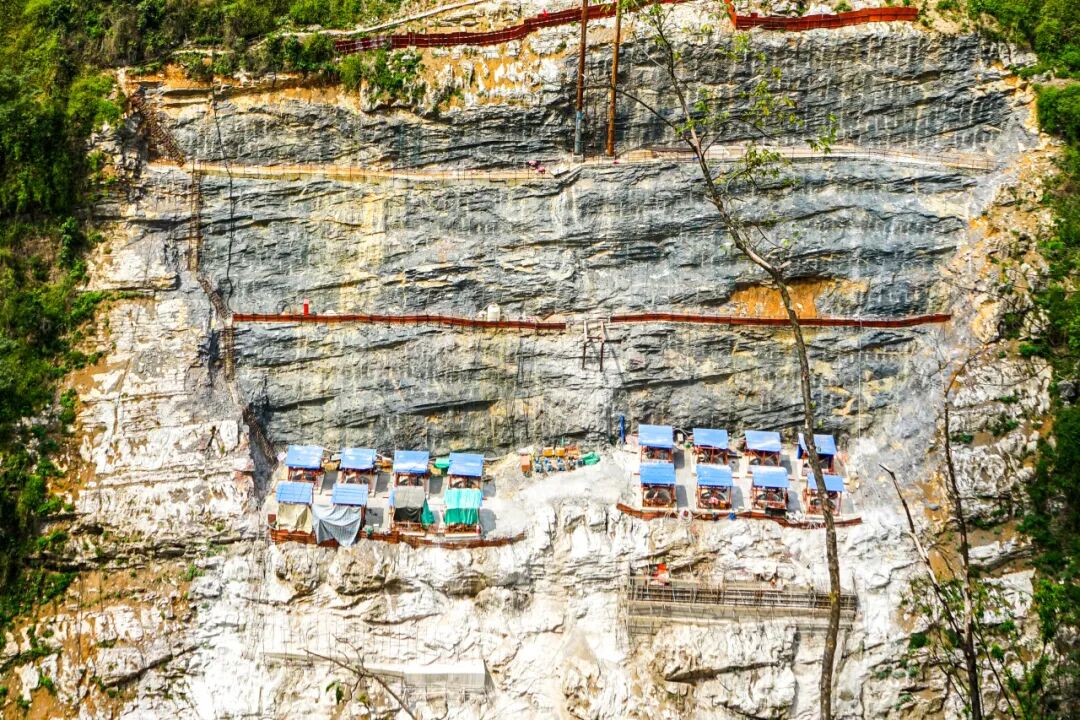 巍峨的云峰之上,历时一年多,作为人员通道和斜线升降机支撑结构的作业平台终于伫立在70°的悬崖峭壁上,在空幽的深山中好似一幅立体山水画。该平台还将作为施工墩柱的存料平台和地泵平台,为项目建设提供源源不断的储备材料。