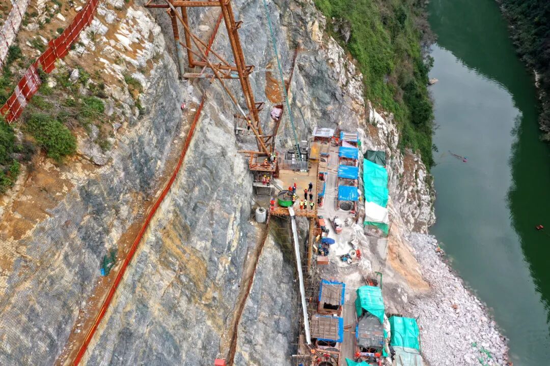 穿石凿壁,依山而建。经过三百多个日夜的艰苦奋战,2023年12月3日,直径2.8米,桩长40米的23号主墩首根桩基成功成孔。