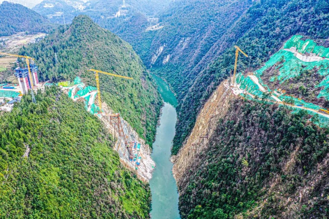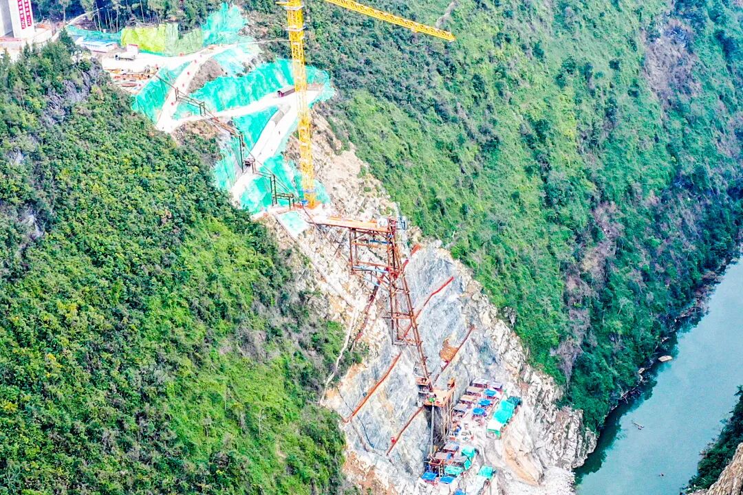 设计方案已定,工程建设随即启动。峭壁之上,各类工程机械相互配合,在北岸山顶率先开工,开凿出一个施工平台,存料场、现场办公室和值班室随即建设。