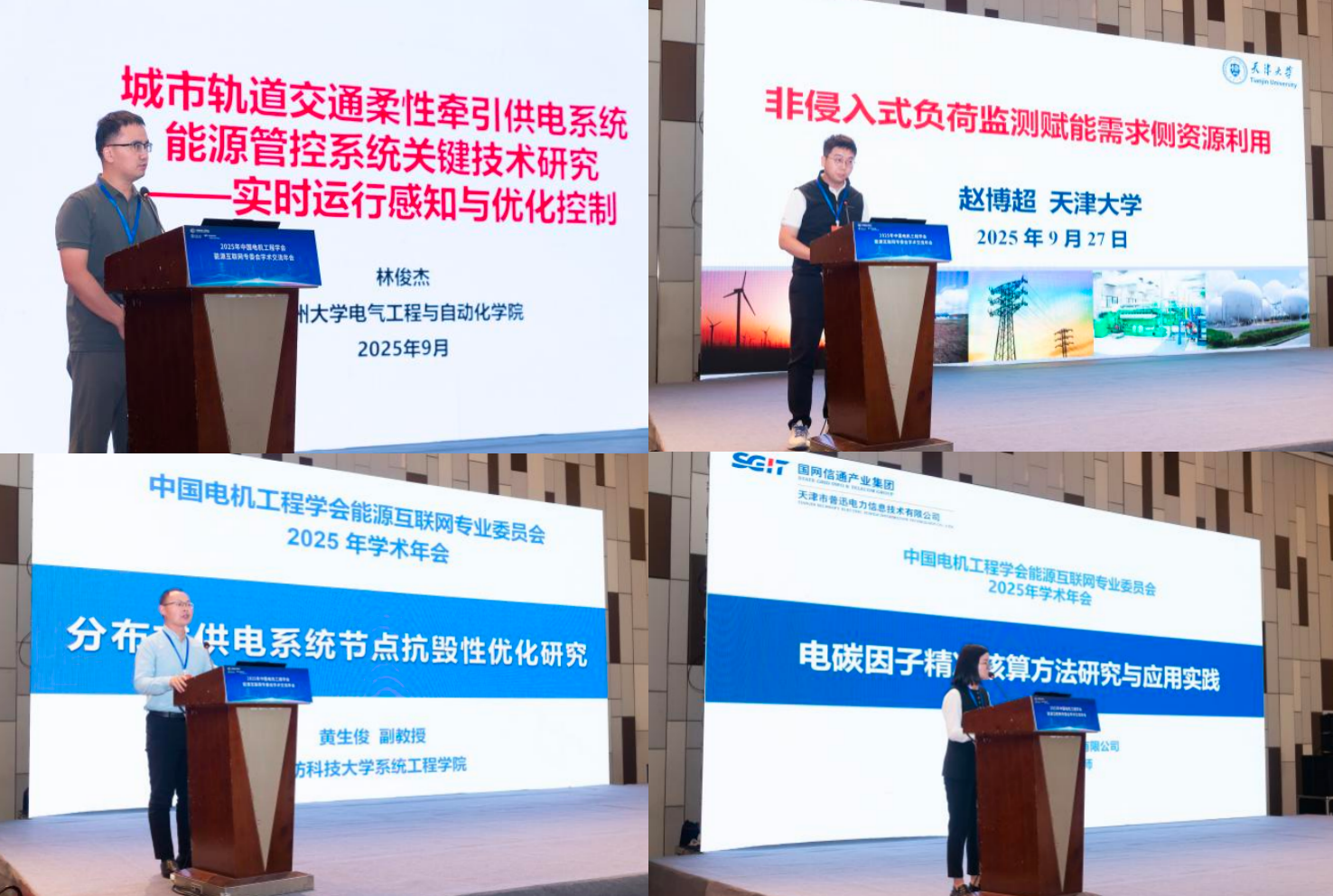 青年学者学术交流环节由天津大学电气自动化与信息工程学院张沛教授主持。福州大学林俊杰副教授、天津大学赵博超副教授、国防科技大学黄生俊副教授、天津市普迅电力信息技术有限公司高级经济师刘涓钰分别作题为《城市轨道交通柔性牵引供电系统的实时运行感知与优化技术》《非侵入式负荷监测技术赋能需求侧资源利用》《考虑网络重构的配电网动态维修策略优化研究》《面向新型电力系统的电碳因子精准核算方法与应用实践》的报告,充分体现了青年学者的创新活力与学术担当。