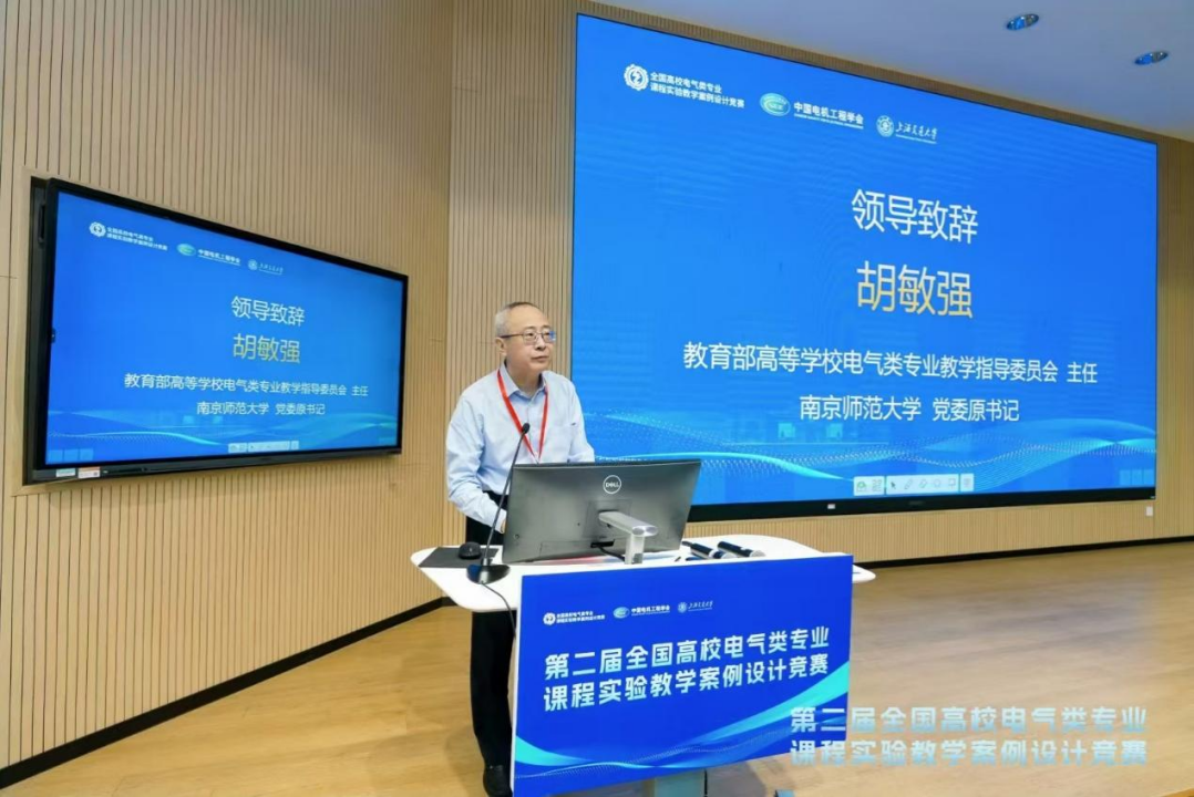 胡敏强阐述了本届竞赛的定位与目标。他表示,为顺应实验教学改革的时代要求,上海交通大学主动担当、积极作为,依托其深厚的电气工程学科积淀与丰富的教学改革经验,全力筹备并成功承办了本届赛事,为全国高校搭建起这一重要的教学交流平台。他认为,本届竞赛通过引入智能控制、数字孪生等新技术,深化产教融合,将有力推动实验教学体系的创新发展。他期待所有参赛教师充分利用这一平台,相互切磋借鉴,将先进教学理念辐射全国,共同促进电气类专业人才培养质量的持续提升。