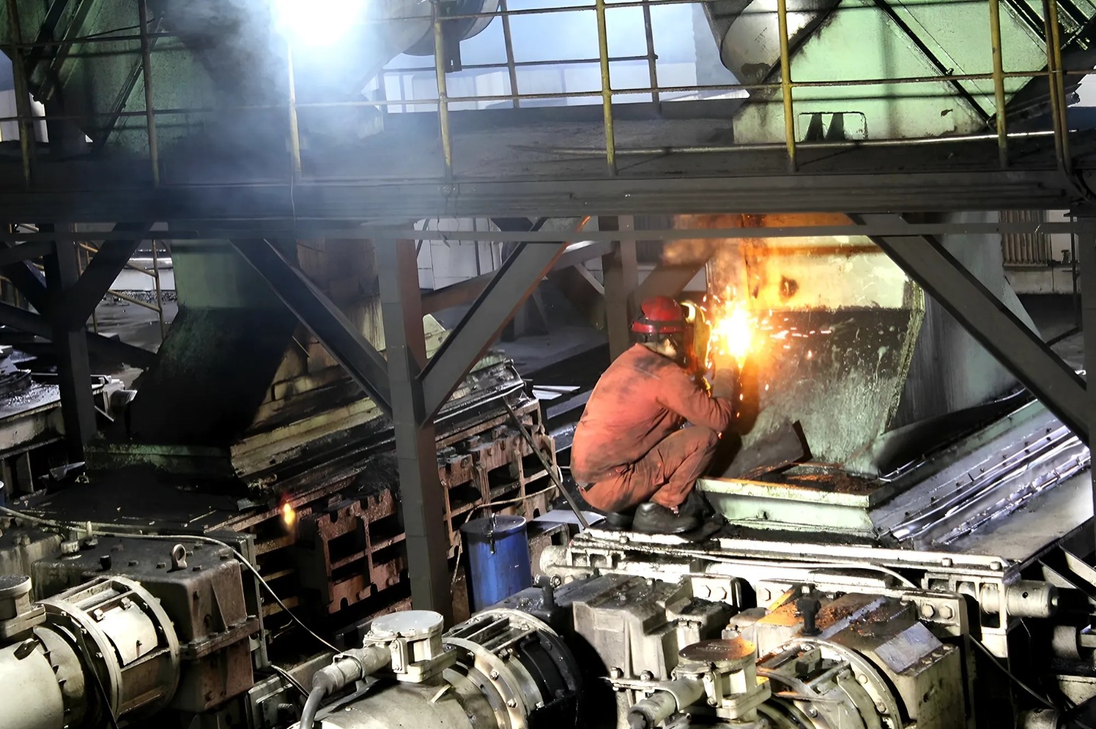 图为焊工正在对244破碎机上溜槽裂口进行补焊