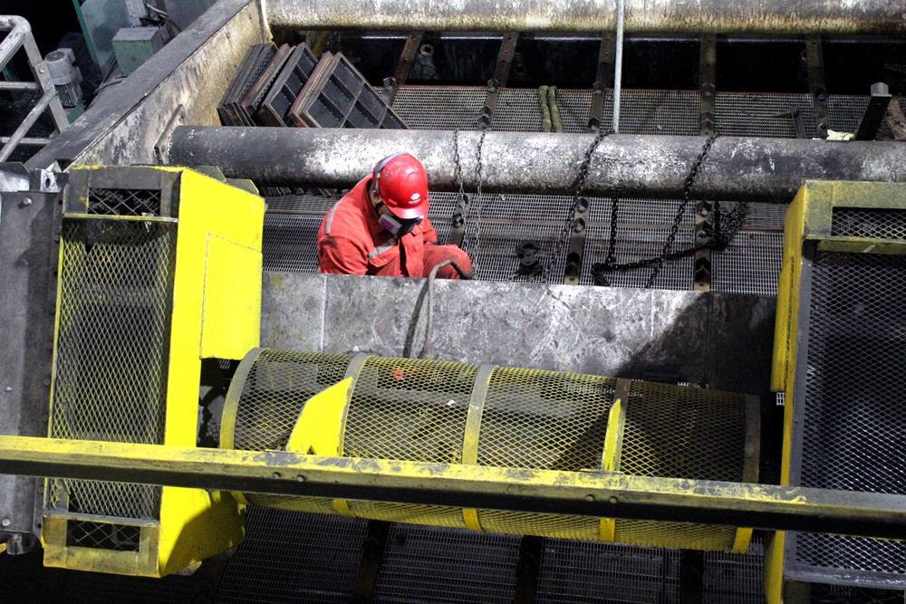 图为职工正在拆卸351精煤筛旧筛板