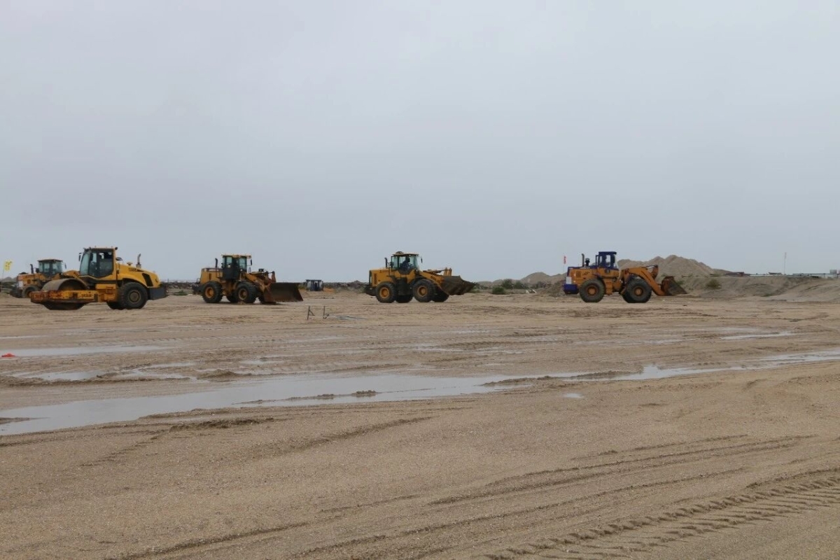 ▲福建三峡海上风电国际产业园建设期荒滩上的工程车忙碌不已
