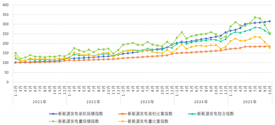 10月非化石能源发电装机规模指数为231.9,“十四五”以来非化石能源发电装机规模累计增长了131.9%,同比增长25.9%;非化石能源发电装机比重指数为136.0,“十四五”以来非化石能源发电装机比重累计增长了36.0%(比重从2020年底的44.8%提高至2025年10月底的60.9%)。其中,10月新能源发电装机规模指数为314.9,“十四五”以来新能源发电装机规模累计增长了214.9%,同比增长34.2%;新能源发电装机比重指数为184.7,“十四五”以来新能源发电装机比重累计增长了84.7%(比重从2020年底的25.7%提高至2025年10月底的47.4%)。
