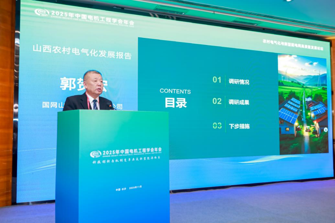 国网山西省电力有限公司副总经理郭贺宏作题为《山西农村电气化发展报告》的报告。报告从山西省经济、地貌、产业差异等出发,对其农村电气化发展情况进行调研总结,取得了四方面成绩:一是电网基础牢固,核心指标提前达标;二是精准赋能产业,电力引擎作用凸显;三是清洁能源普及,零碳示范成效突出;四是生活品质提升,融合治理不断深化。报告结合山西现状和农村电气化未来发展趋势,从电网企业角度出发,提出攻坚方向。