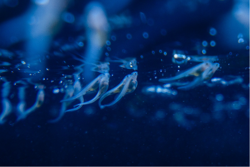 ▲ 子三代中华鲟鱼苗游姿活泼 摄影:王于成
