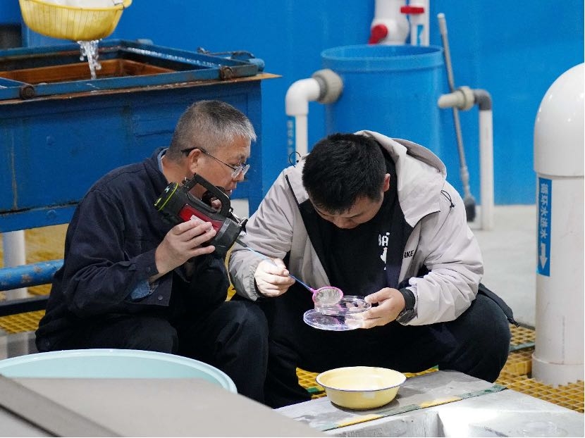 ▲ 科研人员在观察子三代中华鲟鱼卵发育情况 摄影:毛翔春