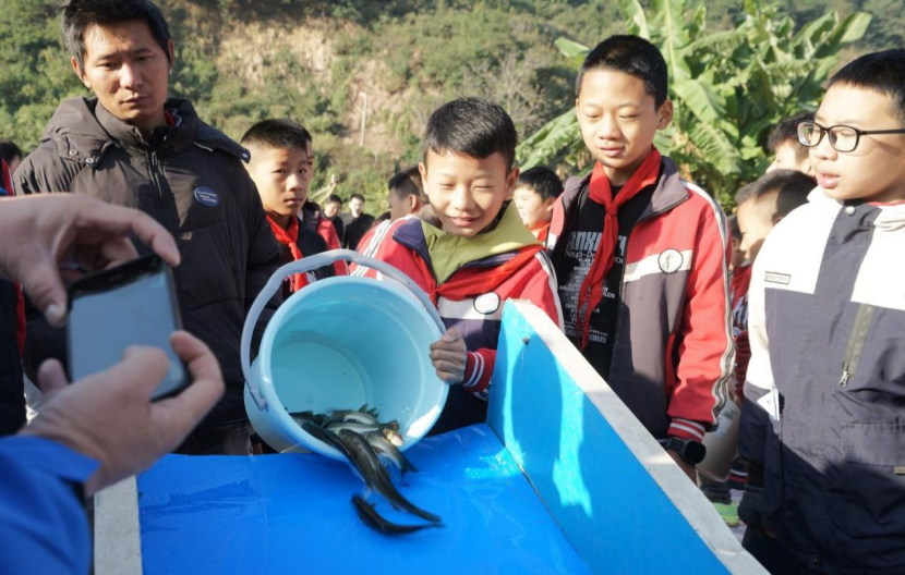 ▲ 松新镇小学生向黑水河放流珍稀特有鱼类