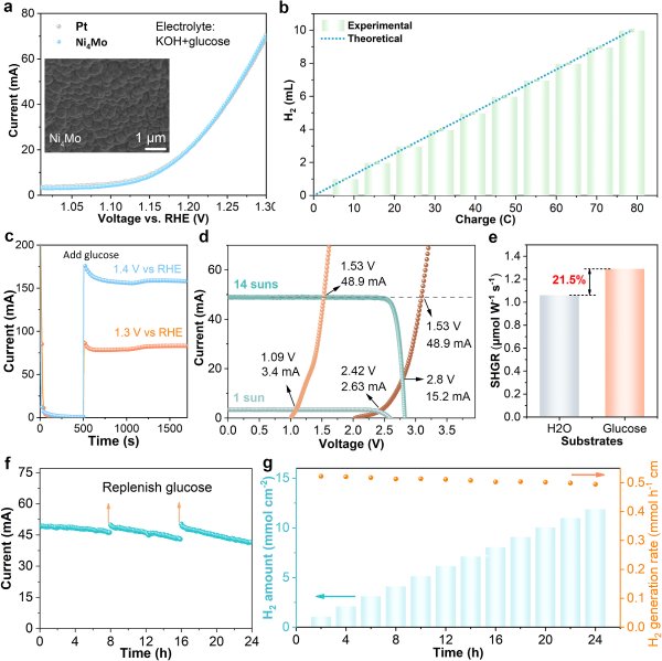 当该阳极体系与地壳丰度较高的Ni4Mo阴极耦合时,在无隔膜电池中可实现近100%法拉第效率的纯氢生成。在聚光太阳照射下,装置的制氢速率达到519.5±0.4μmol·h-1·cm-2,并在连续24小时运行中保持稳定性能。