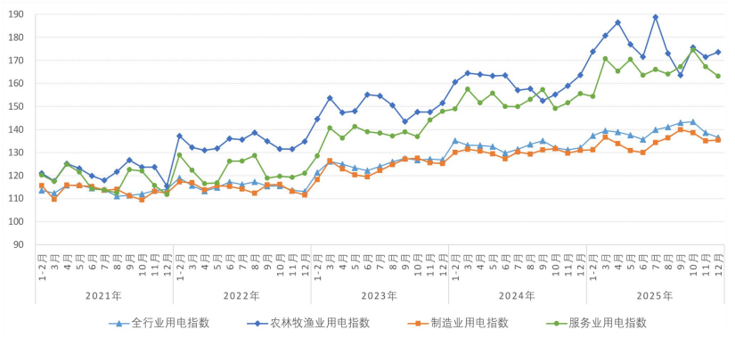2025年12月,全国全行业用电指数为136.6,全行业用电量比2020年基期(以2020年基期为100)增长了36.6%,年均增长6.4%,同比增长3.4%,增速比上月回落2.3个百分点。
