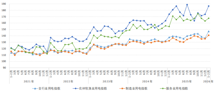 2026年1-2月,全国全行业用电指数为147.0,全行业用电量比2020年基期(以2020年基期为100)增长了47.0%,年均增长6.6%,同比增长6.8%,增速比上年12月提高3.4个百分点。