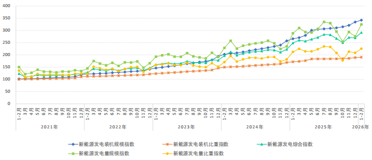 2026年1-2月,全国非化石能源发电综合指数为191.6,比2020年基期(以2020年基期为100)增长了91.6%,同比增长13.5%;其中,新能源发电综合指数为291.6,比2020年基期增长了191.6%,同比增长17.1%。在“双碳”目标引领下,非化石能源及其新能源发电综合指数保持快速增长态势。其中:
