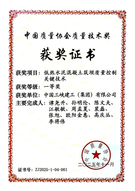 低热混凝土创新成果荣获2025年度中国质量协会质量技术奖一等奖 本网讯(孙明伦)12月3日,2025年度中国质量协会质量技术奖获奖名单在京揭晓。三峡集团所属三峡建工“低热水泥混凝土筑坝质量控制关键技术”项目,凭借硬核创新与显著成效荣获一等奖,成为清洁能源领域质量标杆。 中国质量协会质量技术奖是经国家科技部、国家科学技术奖励工作办公室批准设立,由中国质量协会主办的科学技术奖励,是我国质量技术领域的行业