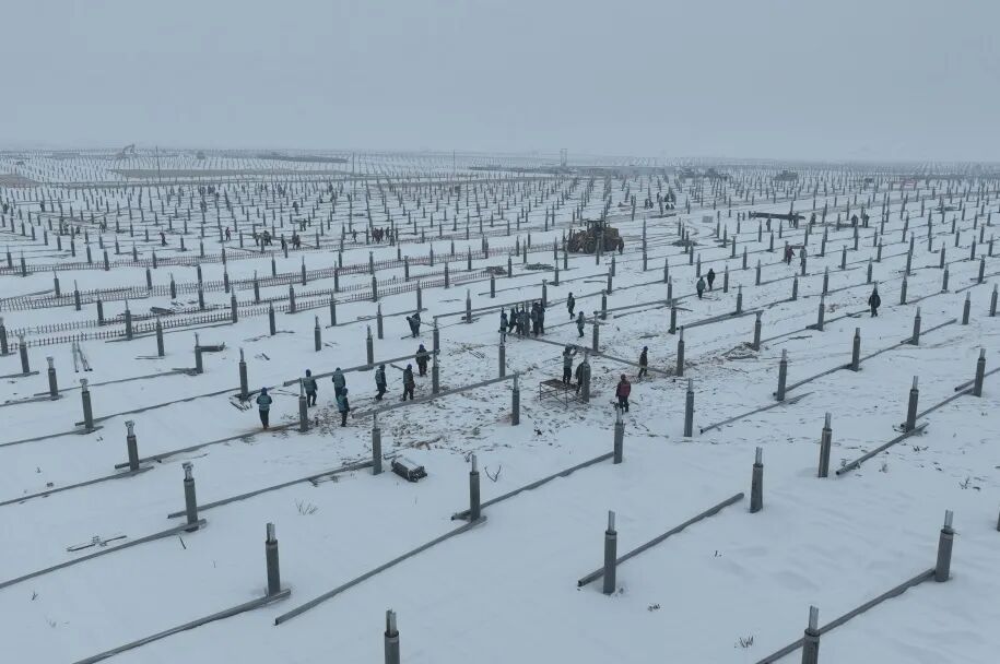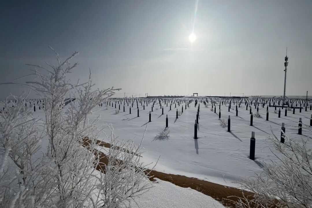 踩着积雪,站在被雪覆盖的沙丘上,已经打好的光伏桩整齐地排列在沙地里,像严阵以待的战士,只待深蓝色的光伏板赋身,便可将沙漠吞噬。