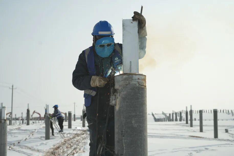 茫茫的沙海里,迎着凌冽寒风,踩在厚厚的积雪里,项目经理李超翔和土建经理张国睿的鞋子已湿透了,他们和施工单位、监理单位值班人员一起,一如往常,一丝不苟地坚守在岗位上,仔细地检查着预制管桩校准、焊桩头和装支架的工程质量,叮嘱施工人员要把控好安全和质量。