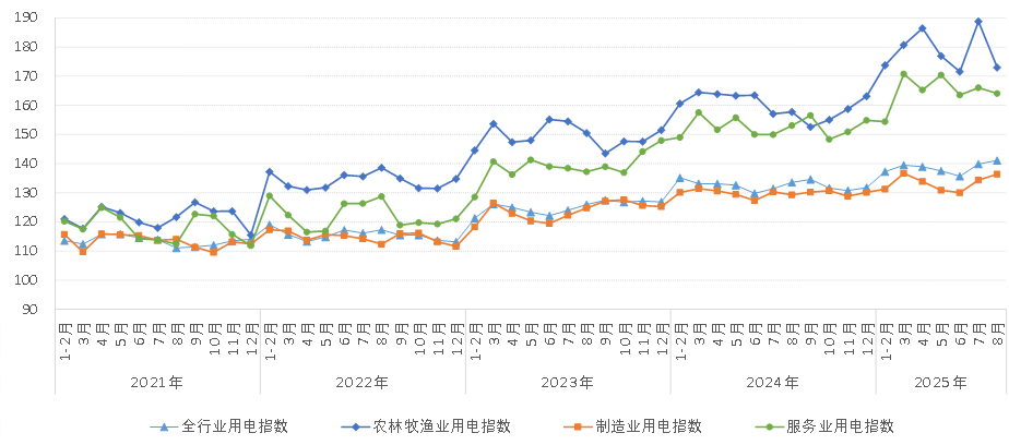 8月,农林牧渔业用电指数为173.0,比2020年基期增长了73.0%,年均增长11.6%,同比增长9.7%。