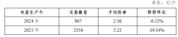 2025年10月,电量生产年为2024年的绿证单独交易平均价格2.56元/个,电量生产年为2025年的绿证单独交易平均价格5.22元/个。