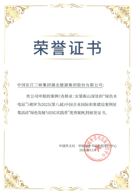本网讯(曹哲)近日,由中国外文局主办的2025中国企业全球形象高峰论坛在安徽合肥举办。论坛期间发布中国企业国际形象案例名单,三峡集团所属湖北能源申报的《查格亚:安第斯山深处的“绿色水电站”》成功入选2025(第八届)中国企业国际形象建设案例征集活动“绿色发展与ESG实践类”优秀案例。
