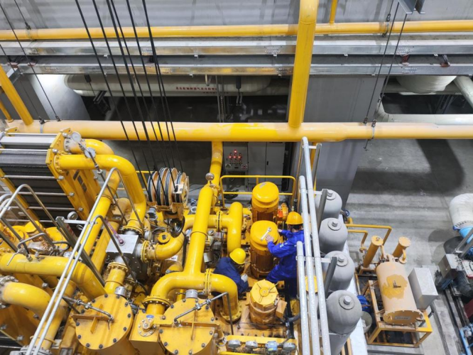 ▲3月4日,在甘肃瓜州“光热储能+”项目建设现场,工作人员正进行油泵电机检修工作。
