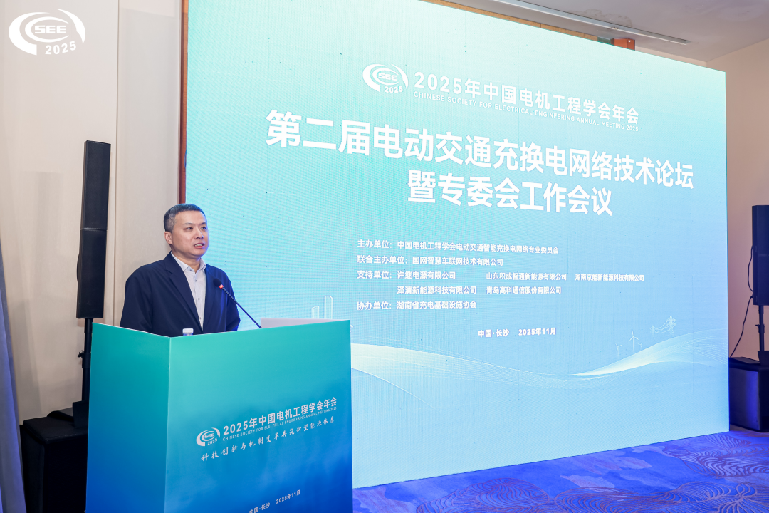 2025年11月24日,作为学会年会专题活动之一,中国电机工程学会电动交通智能充换电网络专业委员会第二届电动交通充换电网络技术论坛暨专委会工作会议在长沙召开。会议由中国电机工程学会电动交通智能充换电网络专业委员会主办,国网智慧车联网技术有限公司联合主办,湖南省充电基础设施协会协办。专委会主任委员、国网智慧车联网技术有限公司总经理樊涛,国网湖南省电力有限公司副总经理、党委委员王健,中国电机工程学会副秘书长崔炜,专委会副主任委员、东南大学黄学良教授,专委会秘书长、国网智慧车联网技术有限公司副总经理王文(线上)以及来自高等院校、科研院所、电力企业等单位的委员、嘉宾及学者100余人参加会议。会议由专委会委员兼副秘书长、国网智慧车联网技术有限公司发展策划部主任徐科主持。