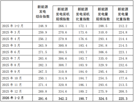 2026年1-2月,全国非化石能源发电综合指数为191.6,比2020年基期(以2020年基期为100)增长了91.6%,同比增长13.5%;其中,新能源发电综合指数为291.6,比2020年基期增长了191.6%,同比增长17.1%。在“双碳”目标引领下,非化石能源及其新能源发电综合指数保持快速增长态势。其中: