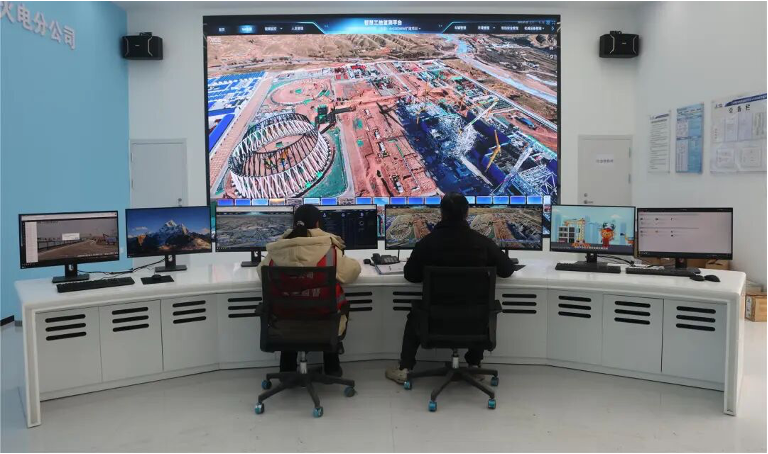 ▲ 库布其基地配套支撑性煤电项目智慧工地指挥中心内,工作人员通过智慧工地管理平台,实时监控施工现场动态,以数字化手段赋能项目安全高效建设。