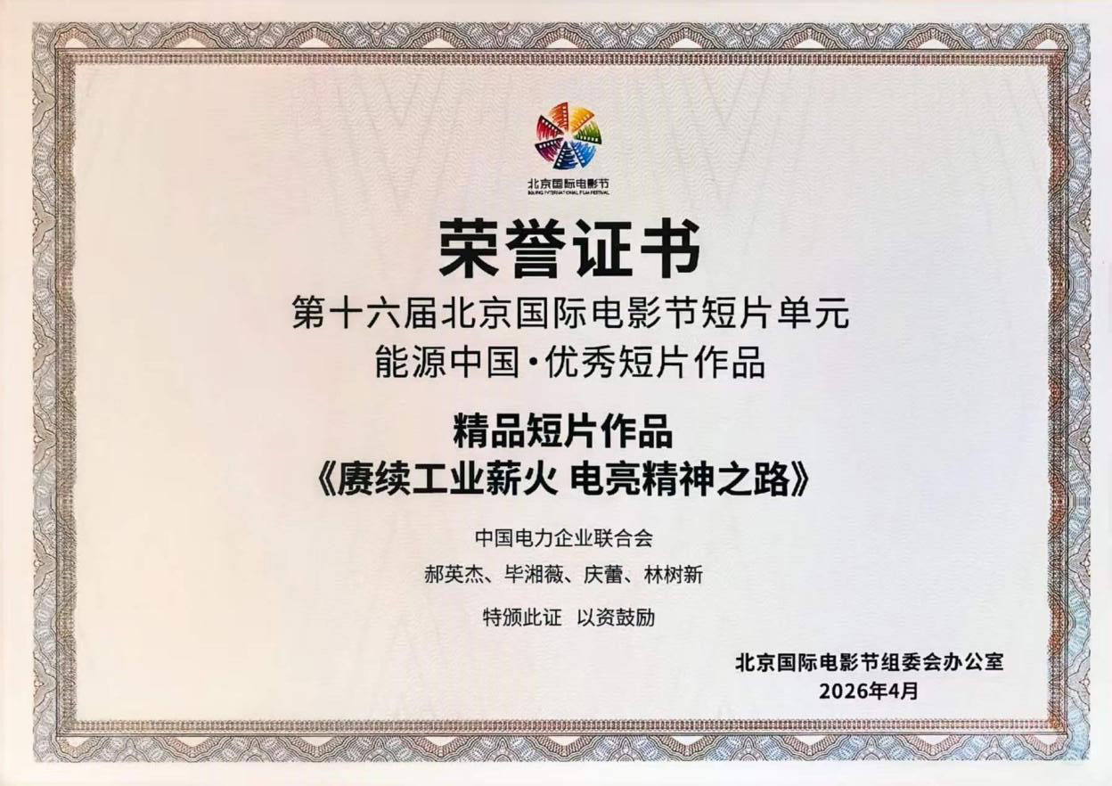 近日,第十六届北京国际电影节“短片单元·能源中国”优秀短片作品评审结果正式揭晓,中国电力企业联合会创作报送的《赓续工业薪火 电亮精神之路》短片从全国1300余部能源领域作品中脱颖而出,被评为精品短片作品。此次获奖,标志着中电联在国家级影视作品奖项领域实现 “零的突破”,是中电联深耕行业文化建设、强化电力精神传播工作的重大成果,更是我国电力行业文化自信的生动彰显。
