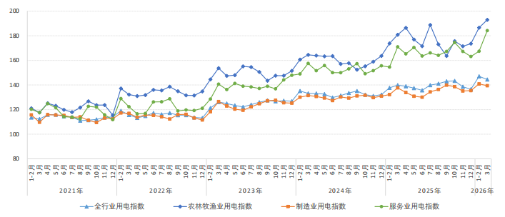 2026年3月,全国全行业用电指数为144.5,全行业用电量比2020年基期(以2020年基期为100)增长了44.5%,年均增长6.3%,同比增长3.3%。