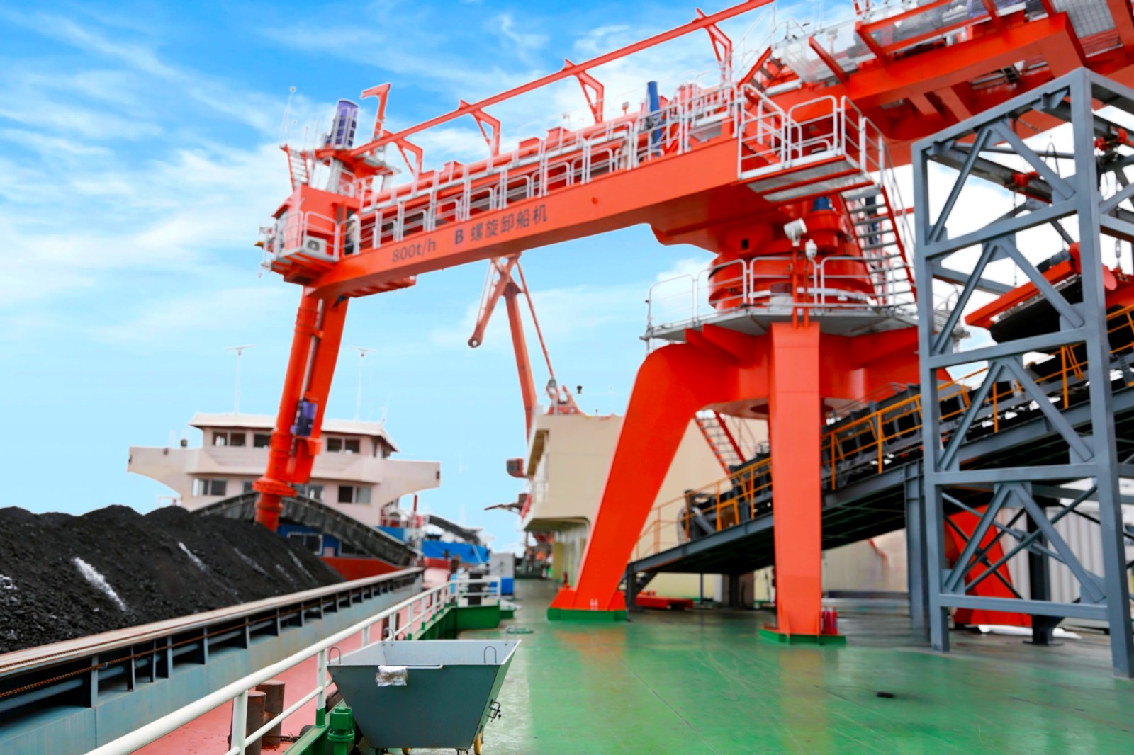 该浮码头是池州电厂码头改造工程的核心设施之一,也是池州电厂二期扩建项目的关键组成部分,承担着保障电厂“口粮”稳定供应的重要使命。作为国内首座搭载双螺旋卸船机的浮码头,其设计兼顾了当下的作业稳定性与未来需求。趸船船体总长130米,宽达20米,单台卸船机装卸效率可达800吨每小时,可满足5000吨级货船靠泊需求,并兼顾10000吨级江海船靠泊。螺旋卸船机直接赋能电厂燃煤的高效、清洁转运:全程封闭抑尘,粉尘近零排放;连续高效作业,卸煤效率跃升;兼容多煤种,工况适应性强。相较传统抓斗式,其综合性能全面领先,真正实现“运煤不见煤,卸船无尘扰”。