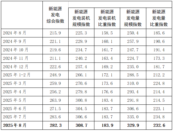 2025年8月,全国非化石能源发电综合指数为177.0,比2020年基期(以2020年基期为100)增长了77.0%,同比增长16.1%;其中,新能源发电综合指数为282.3,比2020年基期增长了182.3%,同比增长30.8%。在“双碳”目标引领下,非化石能源及其新能源发电综合指数保持快速增长态势。其中: