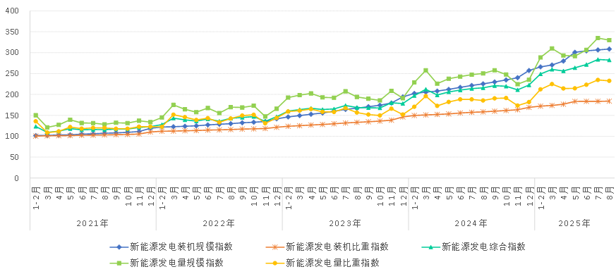 8月非化石能源发电量规模指数为173.9,比2020年基期增长了73.9%,年均增长11.7%,同比增长10.3%;非化石能源发电量比重指数为122.6,比2020年基期比重增长了22.6%。其中,8月新能源发电量规模指数为329.9,比2020年基期增长了229.9%,年均增长27.0%,同比增长31.7%;新能源发电量比重指数为232.6,比2020年基期比重增长了132.6%。