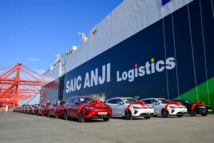 上汽集团旗下9500车位远洋汽车运输船“安吉安盛”轮搭载着上汽自主品牌车型驶往欧洲