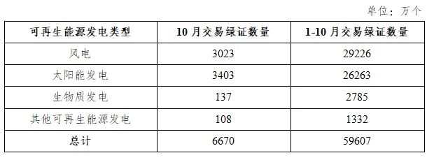 2025年10月,全国交易绿证6670万个,其中绿色电力交易绿证2299万个。2025年1~10月,全国交易绿证5.96亿个,其中绿色电力交易绿证2.02亿个。