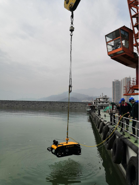 ▲ 1800米缆水下机器人在三峡电站副坝准备入水开展检查
